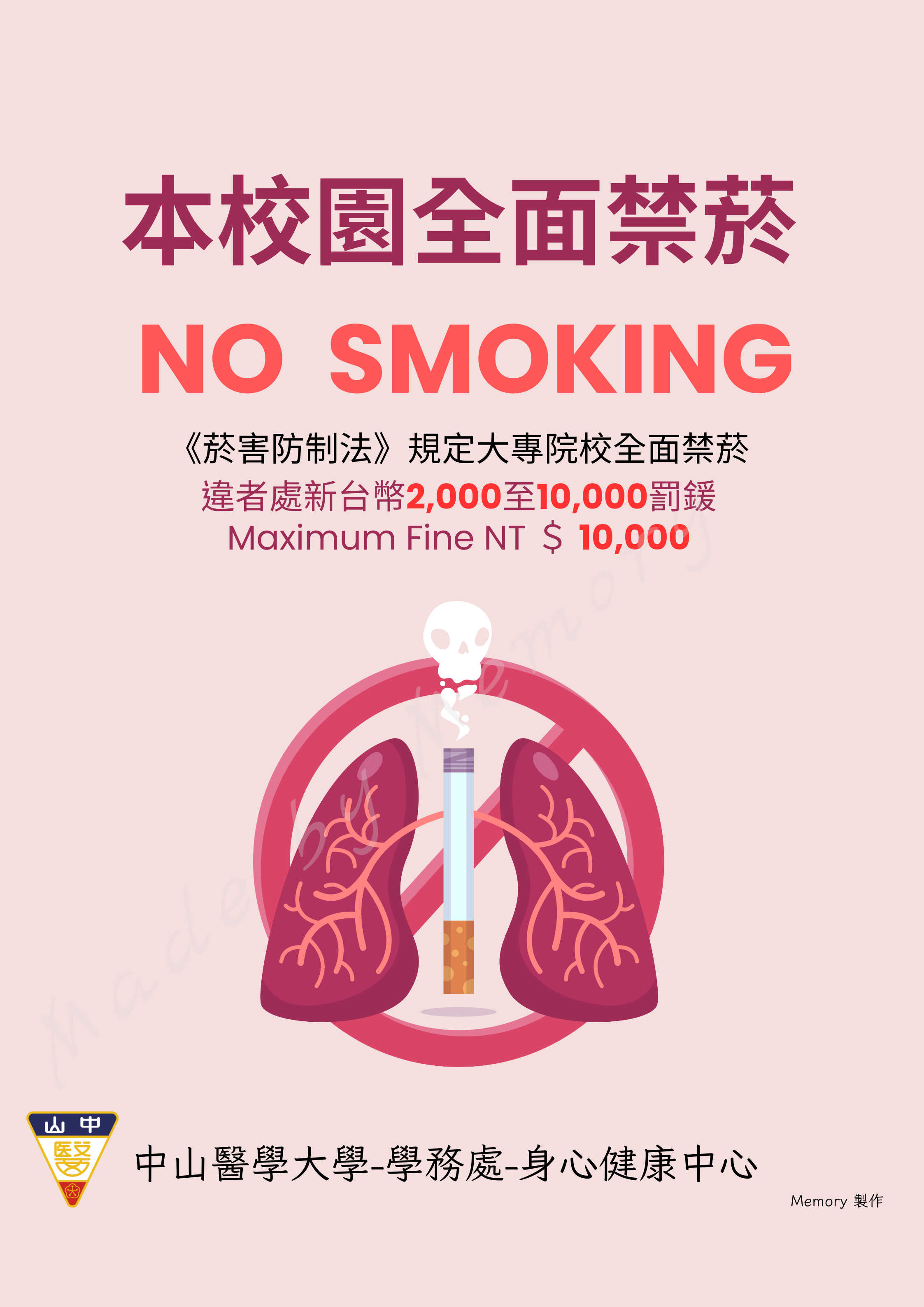 校園範圍內(含室內外空間)全面禁止吸菸。
