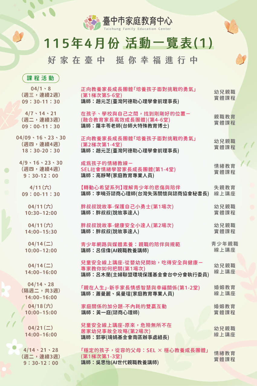 【活動訊息】台中市家庭教育中心115年4月份活動一覽表