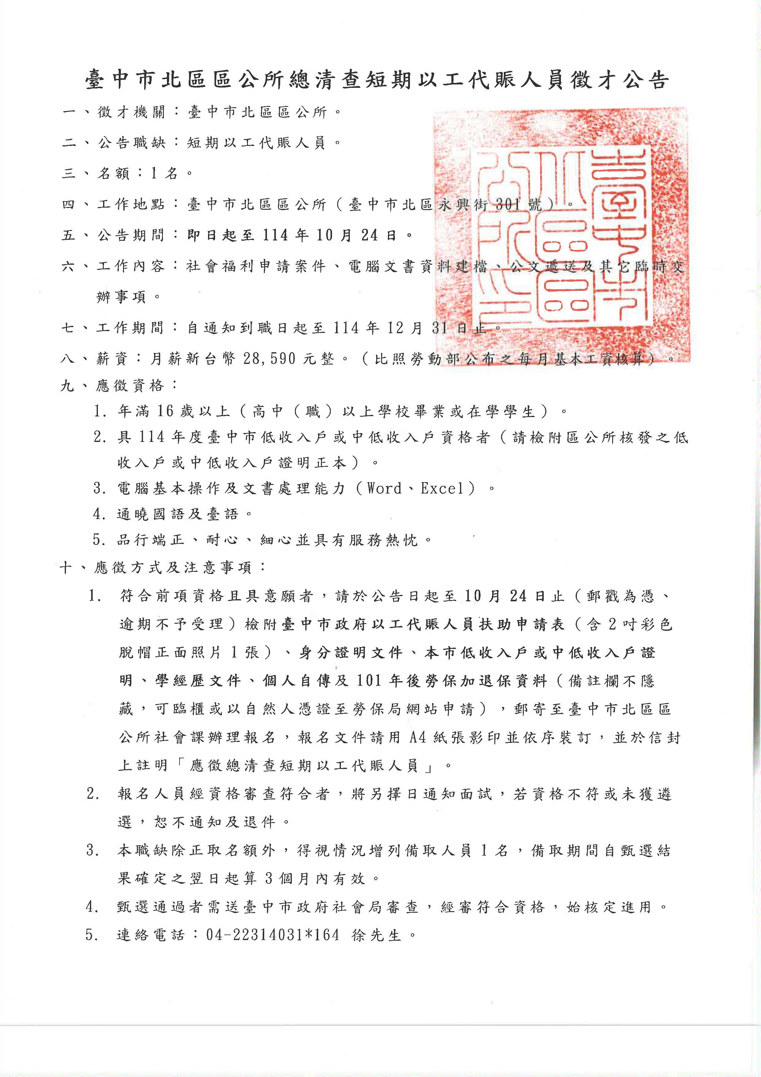 臺中市北區區公所 - 114年總清查短期以工代賑人員徵才公告