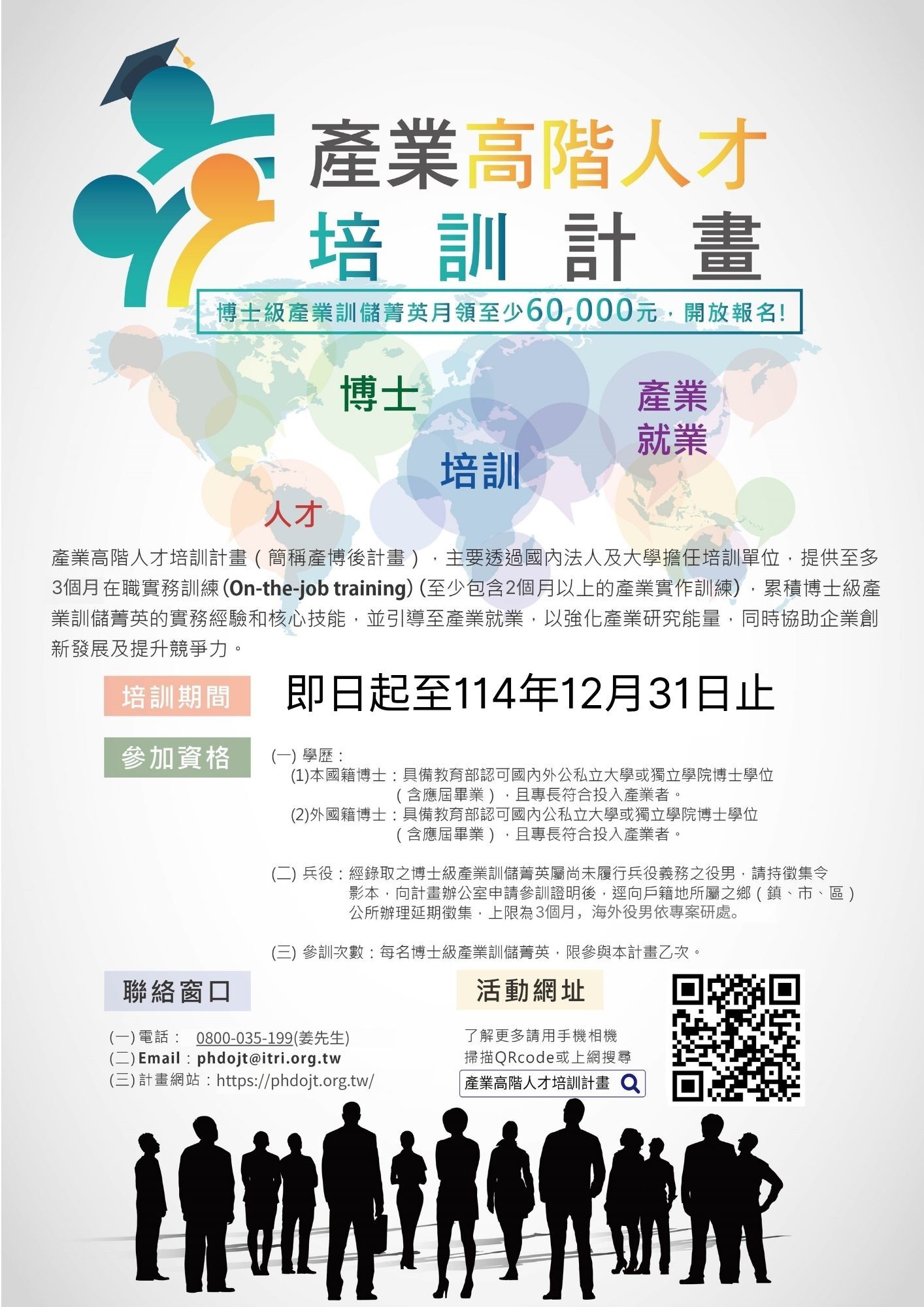 二、 為增進培訓單位與博士級人才面談機會,訂於114年10月22日(三) 台南大飯店、114年10月27日(一) 政大公企中心,辦理人才甄選會,活動報名連結:https://forms.gle/2VDiW2KvGpSERrDi9。或至計畫網站:https://phdojt.org.tw/查詢相關活動訊息。