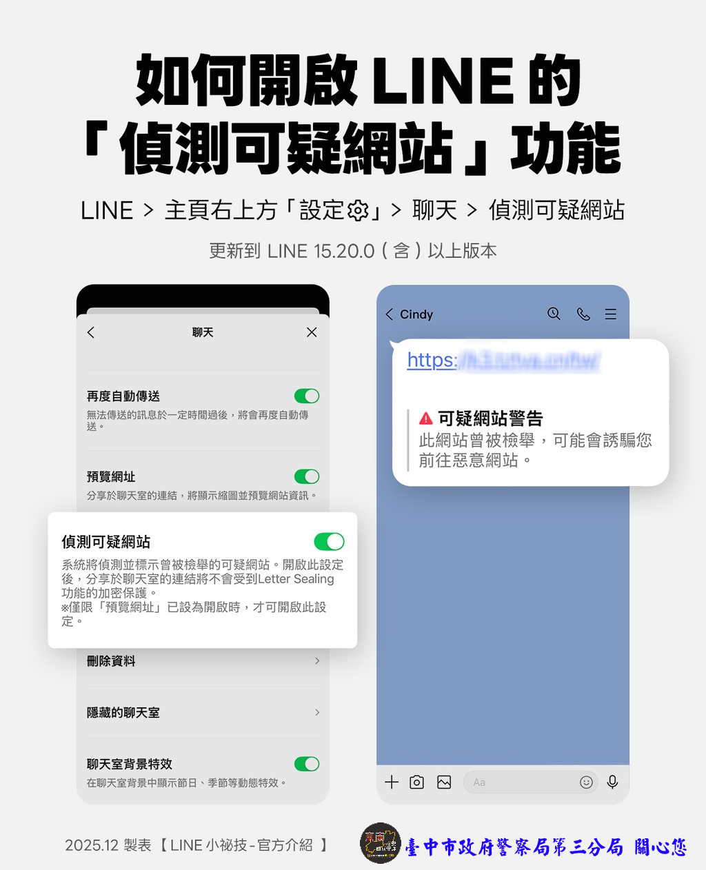 🔔提醒您,除了開啟功能來過濾可疑網站,更要養成「不亂點不明連結」、「不輕信陌生訊息」、「不分享LINE認證碼」的良好習慣,如有任何疑慮,務必主動撥打☎️ 165 反詐專線查證。