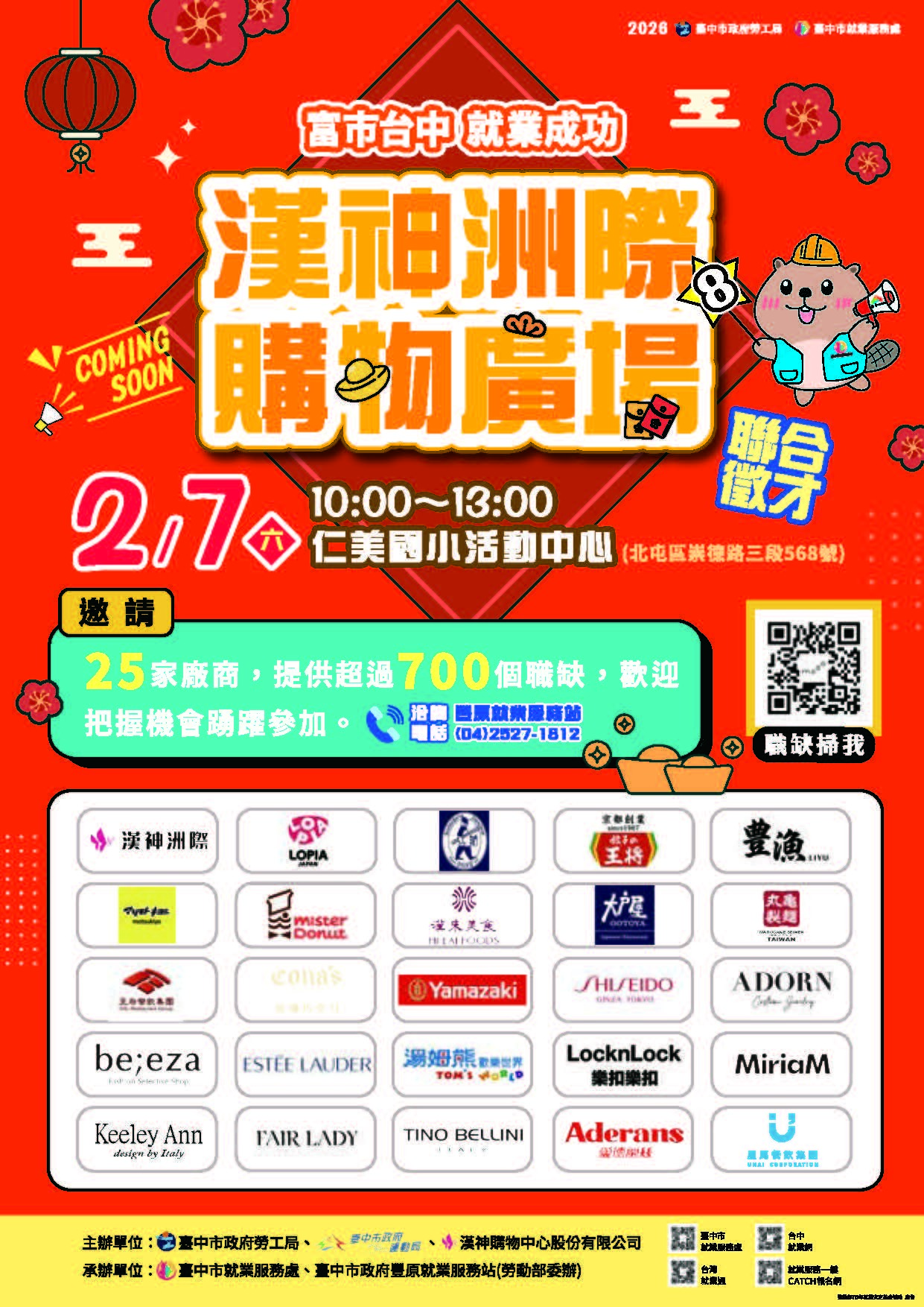 漢神洲際購物廣場徵才開跑囉!臺中市政府勞工局與漢神公司攜手合作,將於2月7日(星期六)上午10時至下午1時在北屯區仁美國小辦理徵才,邀請漢來美食、日商樂比亞及豊漁等25家進駐廠商,提供超過700個職缺,歡迎踴躍參加。活動詳情請至臺中市就業服務處官網查詢,或撥打04-25271812豐原就業服務站洽詢。