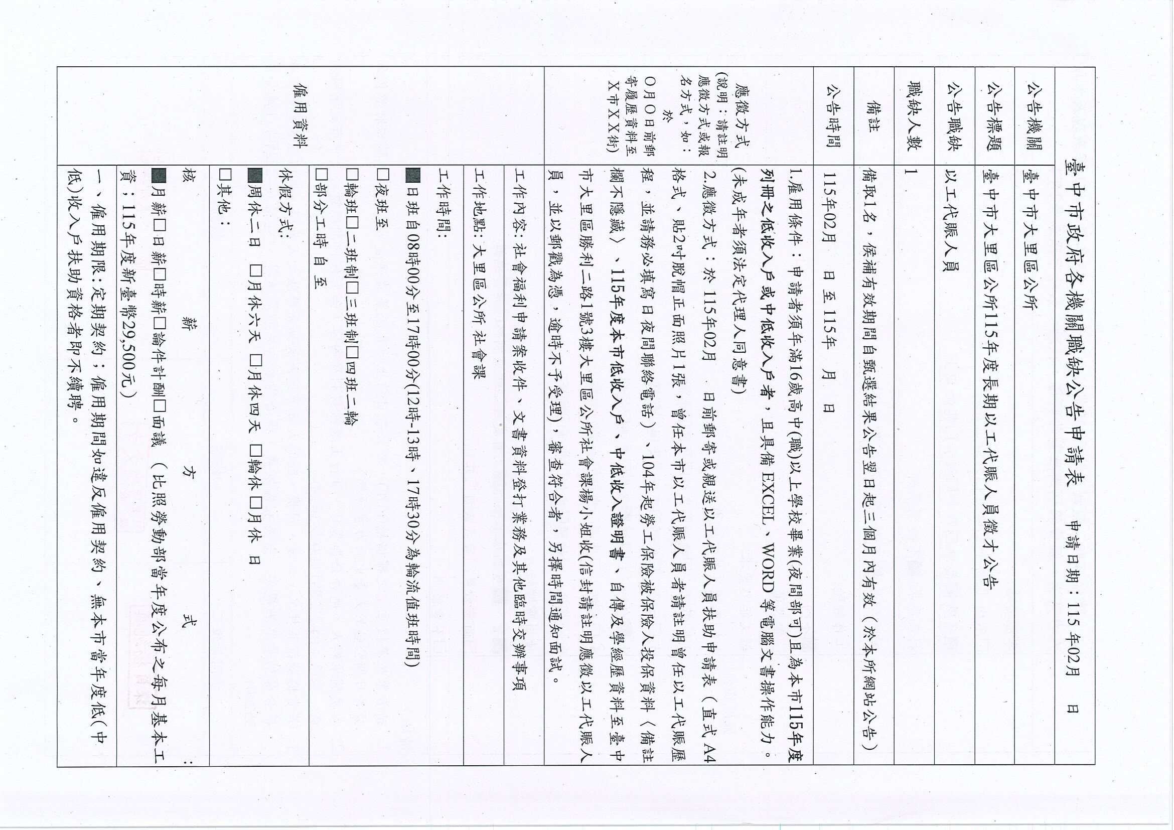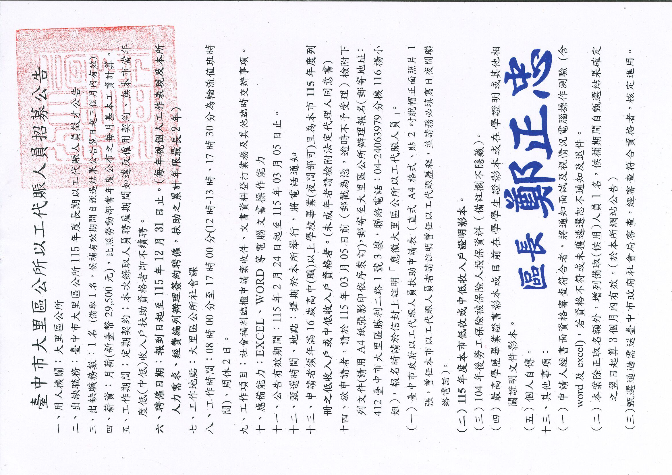 臺中市大里區公所 - 115年度低收入戶及中低收入戶長期以工代賑人員徵才公告