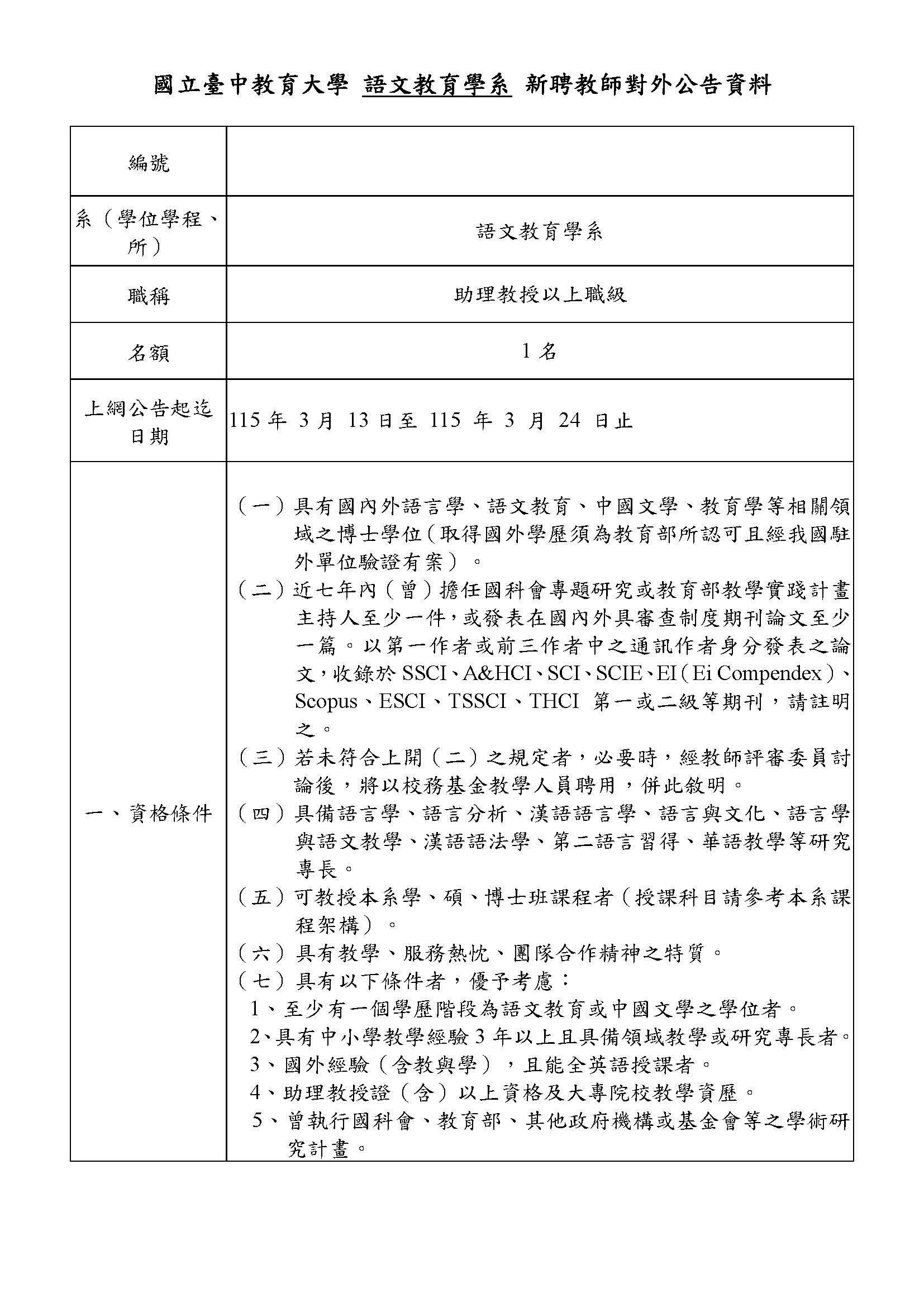 國立臺中教育大學 - 語文教育學系公開徵求115學年度第1學期助理教授級(含)以上教師1名