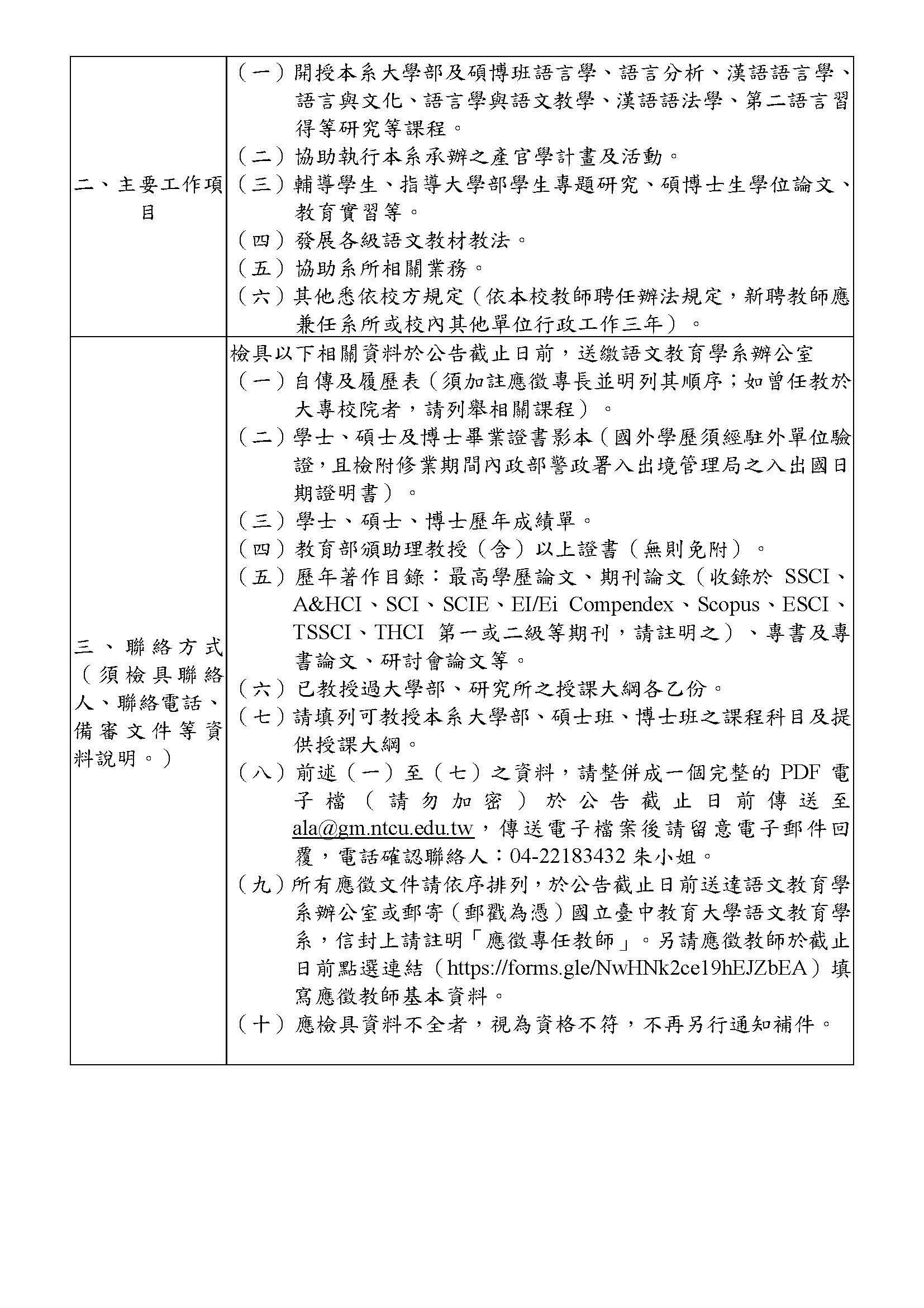 三、 受理日期自即日起至115年3月24日止(郵戳為憑),相關資料請寄至「403臺中市西區民生路140號,國立臺中教育大學語文教育學系收」,並請於信封上註明「應徵專任教師」;自傳、履歷表、學士、碩士及博士畢業成績單及畢業證書、教育部頒助理教授(含)以上證書(無則免附)、歷年著作目錄及可教授本系大學部、碩士班、博士班之課程科目及授課大綱之電子檔另請傳ala@gm.ntcu.edu.tw後,電話確認,聯絡人:04-22183432朱小姐。