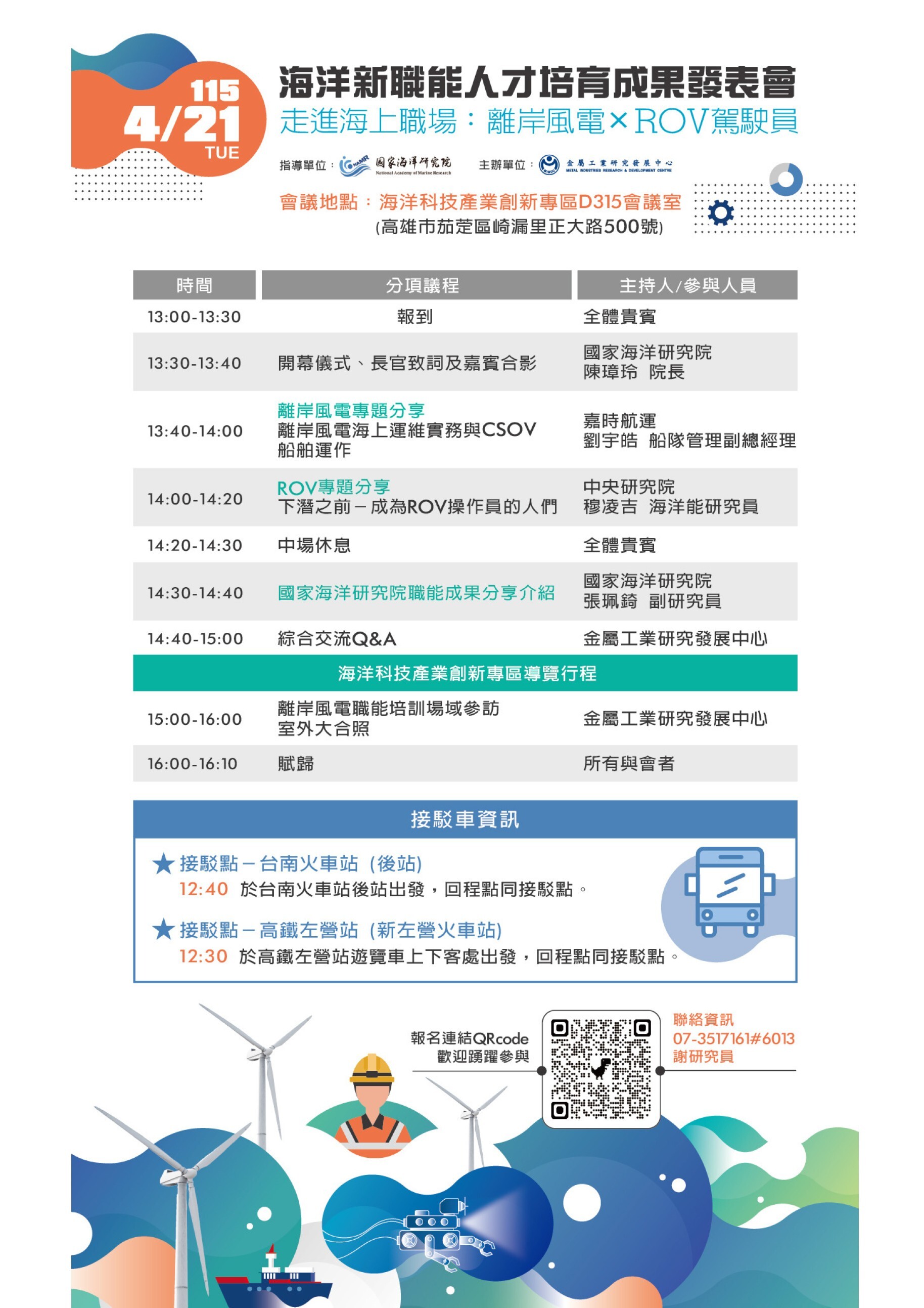 一、為落實海洋國家願景並精準對接產業人力需求,本院訂於115年4月21日辦理「海洋新職能人才培育成果發表會」,聚焦離岸風電及ROV(水下遙控無人載具)等海洋產業領域,邀請產業專家分享產業發展與職涯經驗。