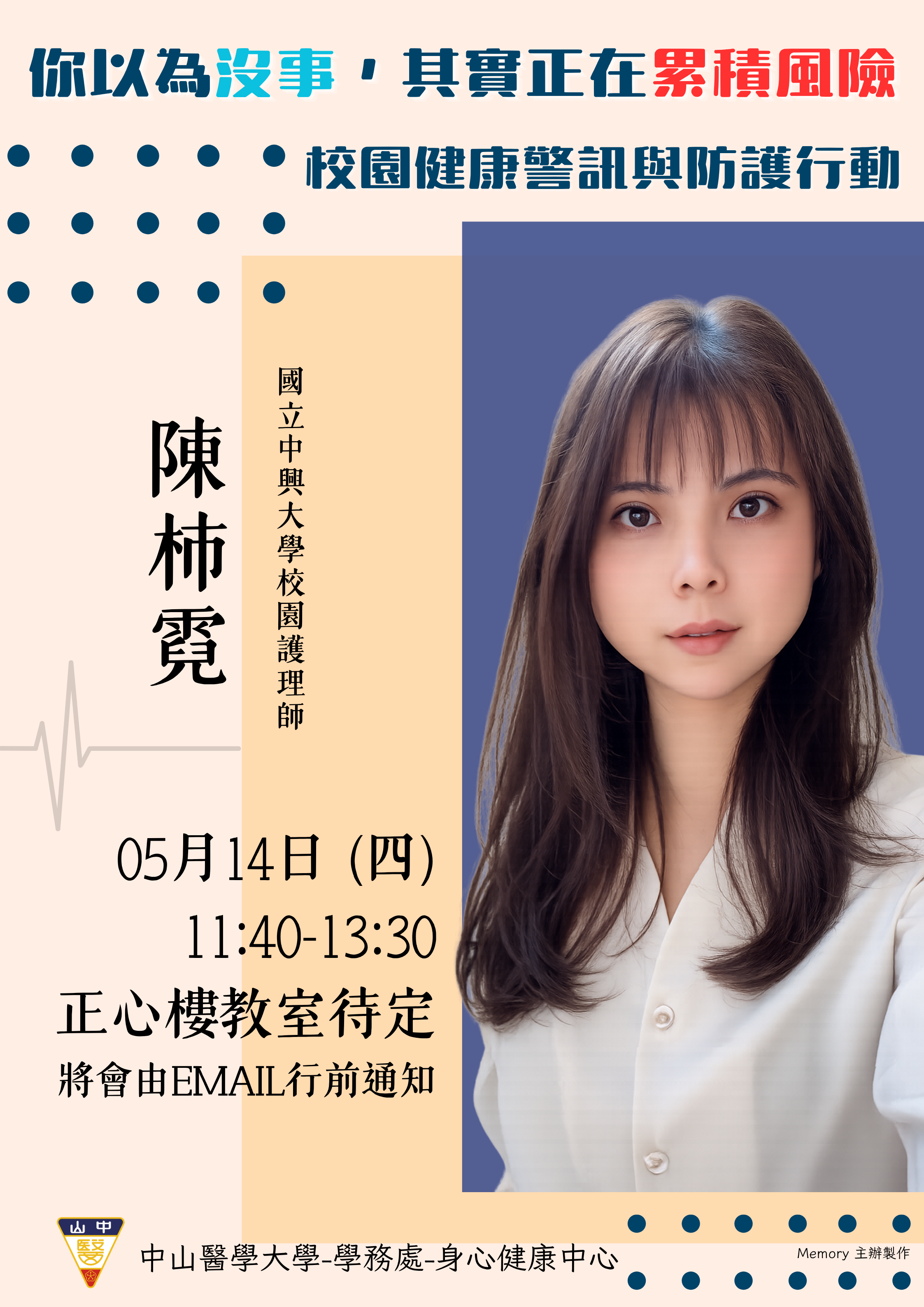 💬 熬夜、飲食不均、缺乏運動、壓力堆積──這些看似「沒事」的小習慣,其實正在默默累積健康風險!本次活動邀請資深的中興大學校園護理師,帶你深入了解校園生活中常見的健康警訊,並透過案例解析與防護行動的分享,幫助你建立正確的健康觀念,學會如何在日常生活中守護自己與同儕的健康